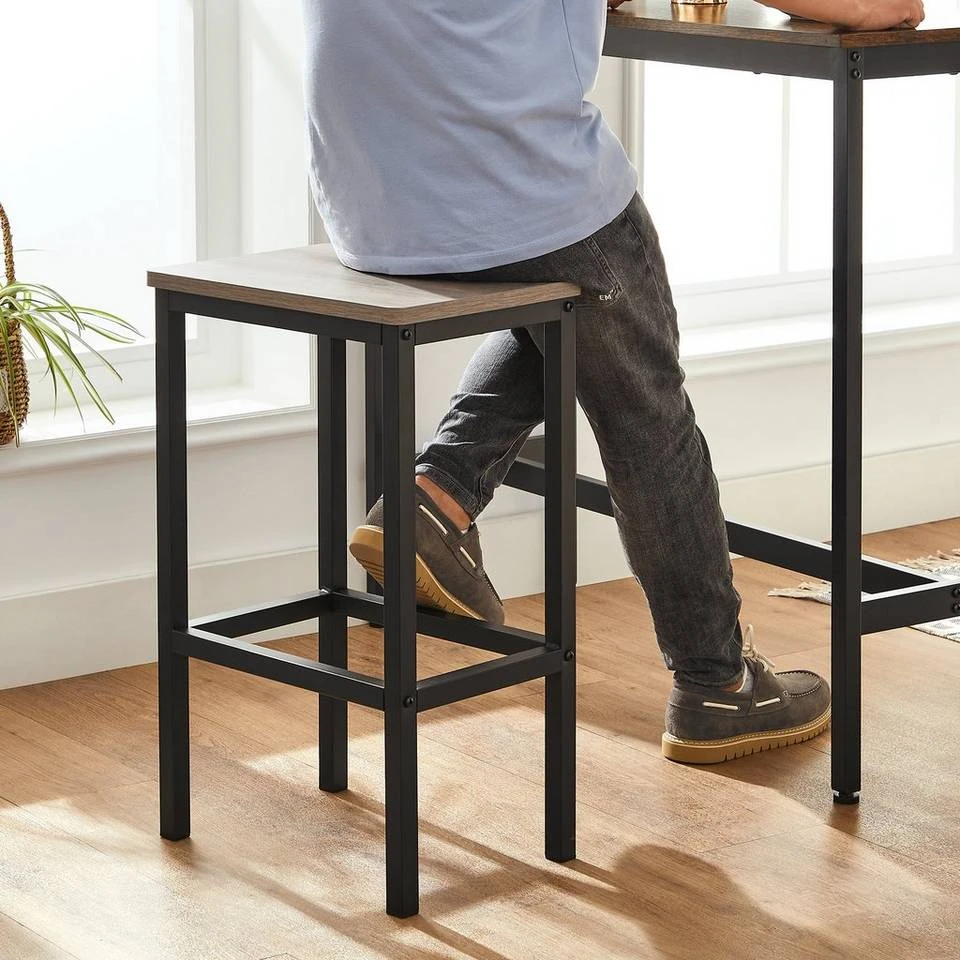 - Das schwarze Eisengestell der Barstühle bildet einen ansprechenden Kontrast zu den Holztönen der bis zu 120 kg belastbaren Sitzflächen