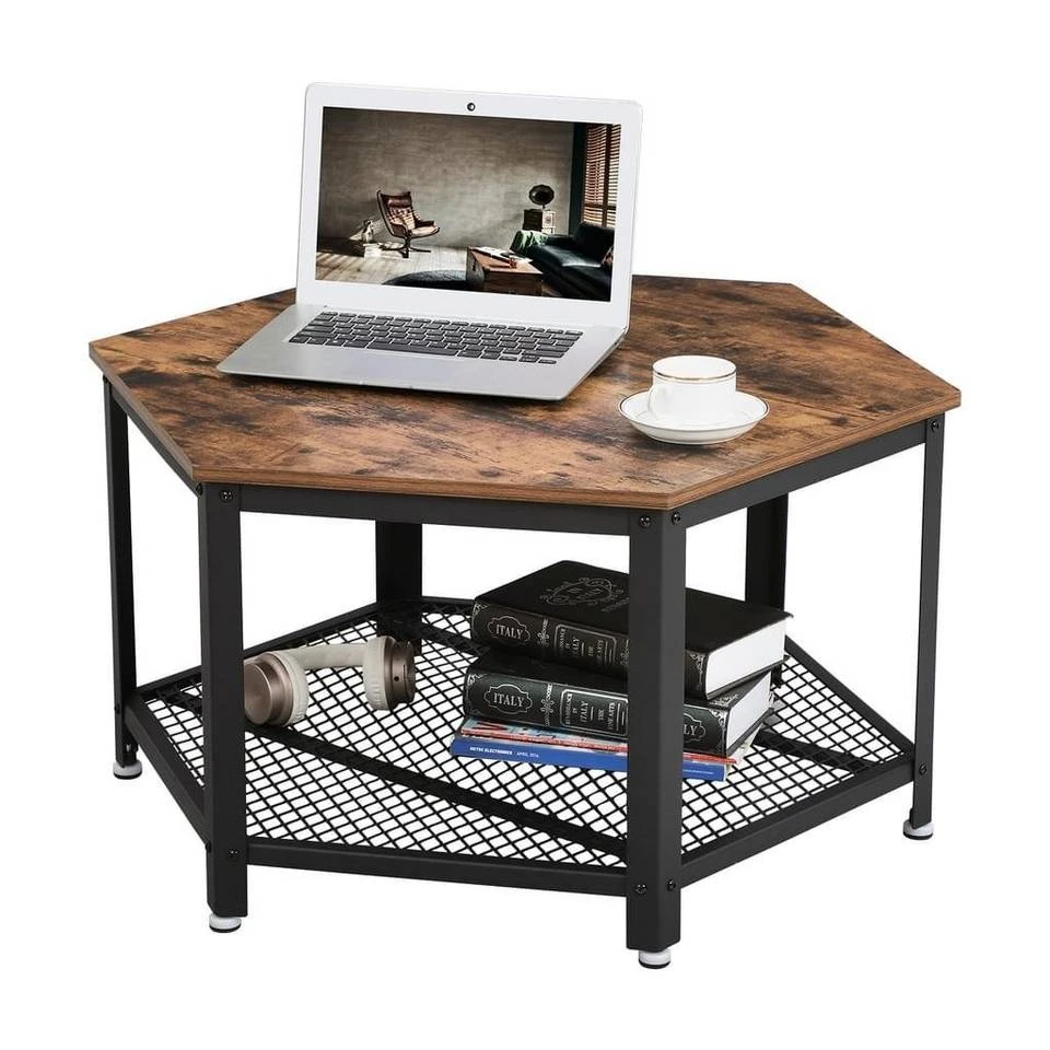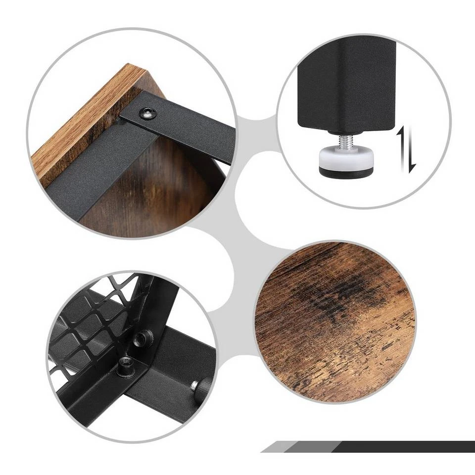 - Das Eisengestell hat jedoch noch lange nicht ausgedient und bietet der Tischplatte stets einen starken Halt; genauso wie der Gitterablage, auf der Sie Ihren Laptop ablegen können