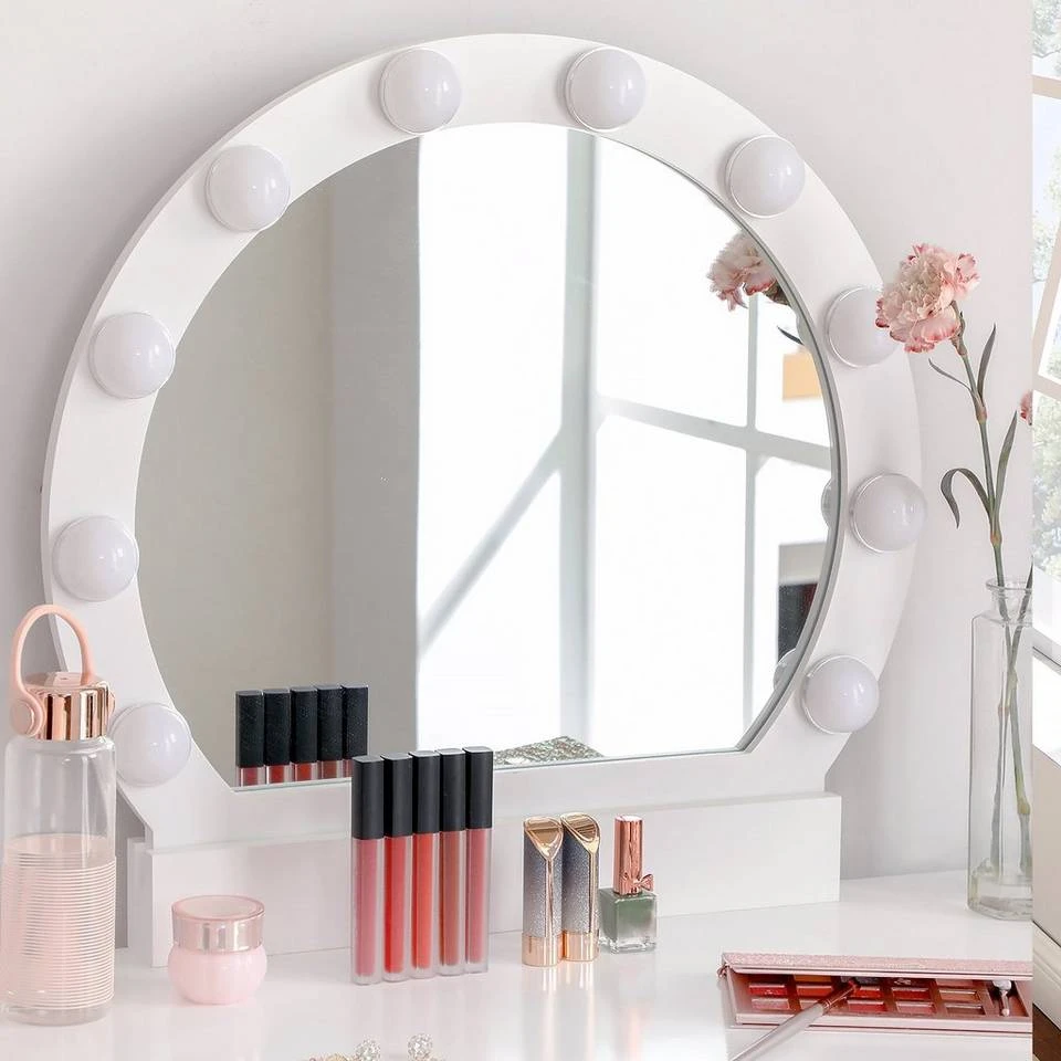 Die Glühbirnen verschönern nicht nur den kreisförmigen Spiegel. Vielmehr sorgen Sie auch für ausreichend Licht, wenn Sie Ihr Make-up auftragen oder sich Details in Ihrem Gesicht anschauen möchten. So müssen Sie nicht noch einen zusätzlichen Kosmetikspiegel oder eine extra Lampe kaufen.