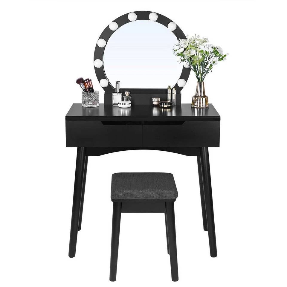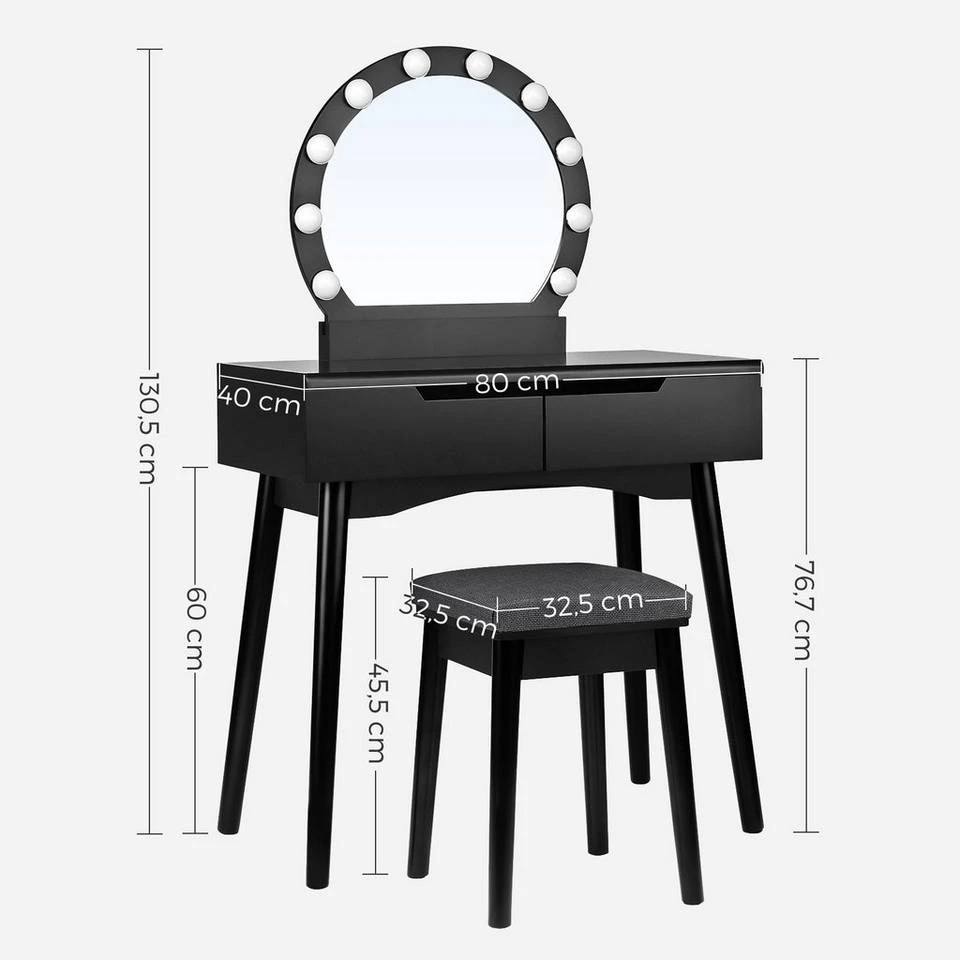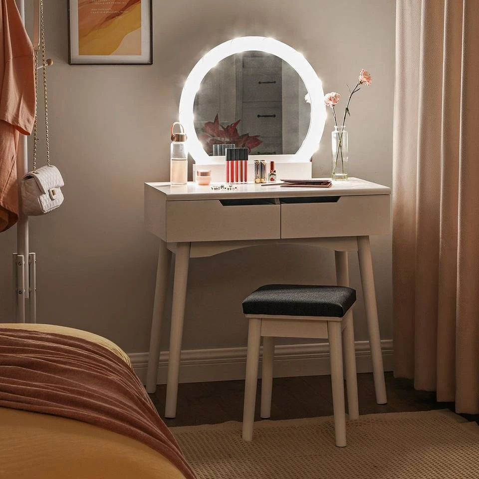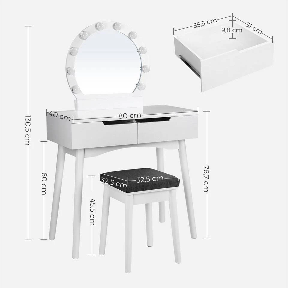 - WAS SIE BEKOMMEN: Einen Schminktisch mit vormontierten Schubladen, einen runden Spiegel, 10 Glühbirnen und eine Ersatzbirne, einen gepolsterten Hocker, eine detaillierte Anleitung