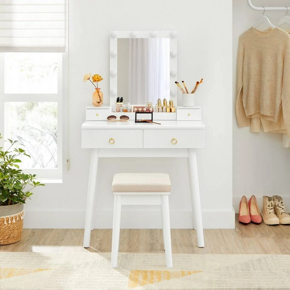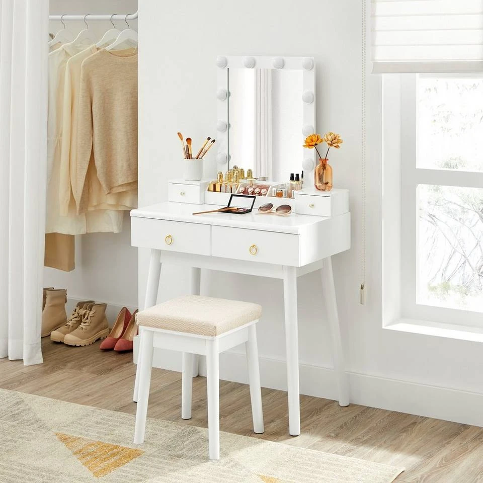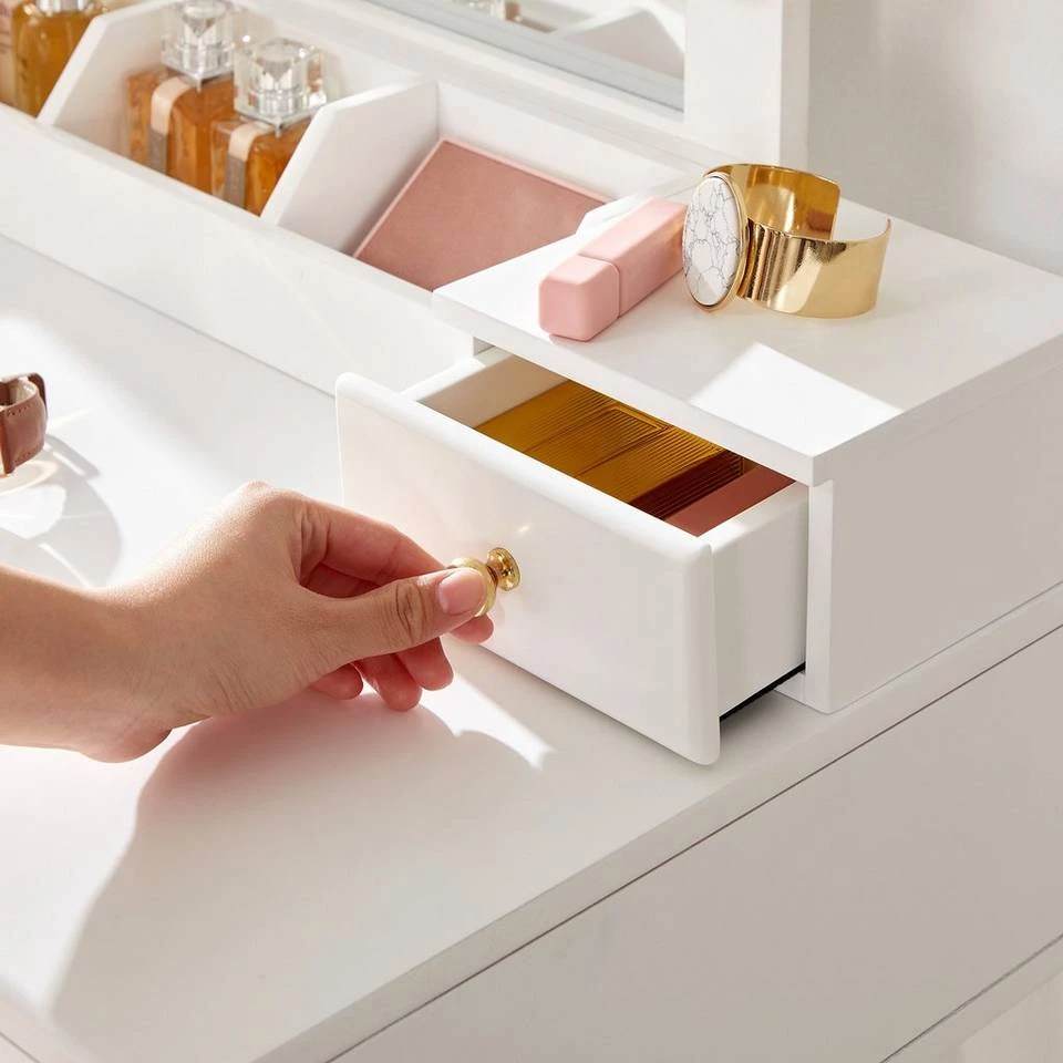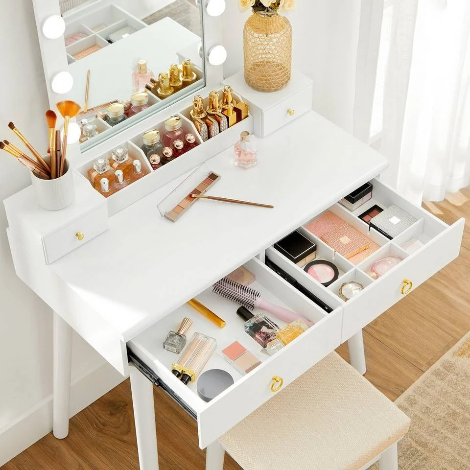 - 1 abnehmbare Ablage mit 3 Fächern, 2 kleine Schubladen oben, 2 große unten – All Ihr Make-Up passt perfekt in diesen Tisch
