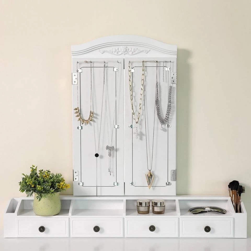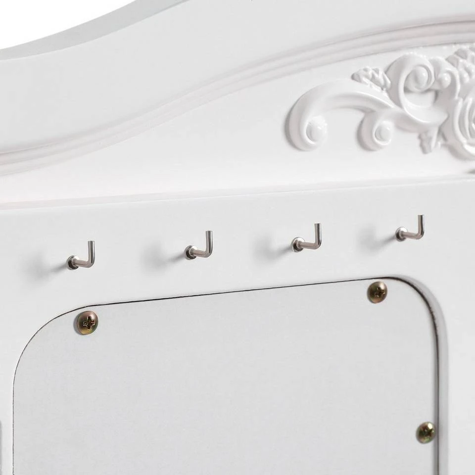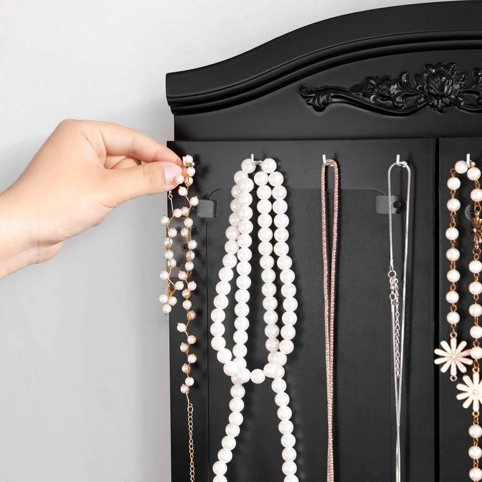 Der 3-teilige Spiegel ermöglicht es Ihnen, Ihr Spiegelbild aus verschiedenen Blickwinkeln zu betrachten, während Sie Ihr Make-up auftragen oder Haar frisieren. Übrigens, Sie werden vielleicht überrascht sein, dass Sie hinter dem Spiegel 8 Haken für Halsketten vorfinden werden.