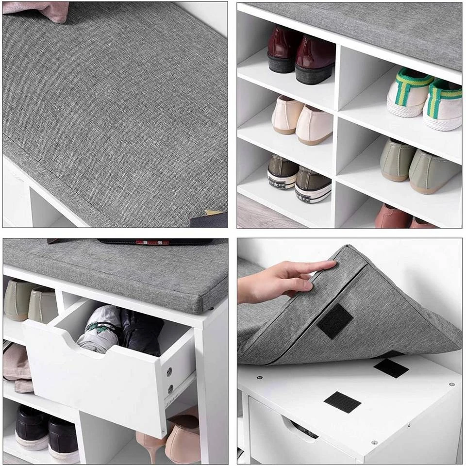 - Eine Schuhbank, welche aus robustem E1-Klasse Holzwerkstoff gefertigt ist und die zudem über einen abnehmbaren Sitzbezug zur einfachen Reinigung verfügt